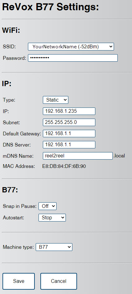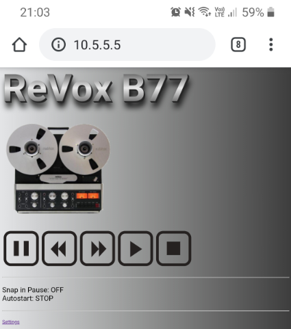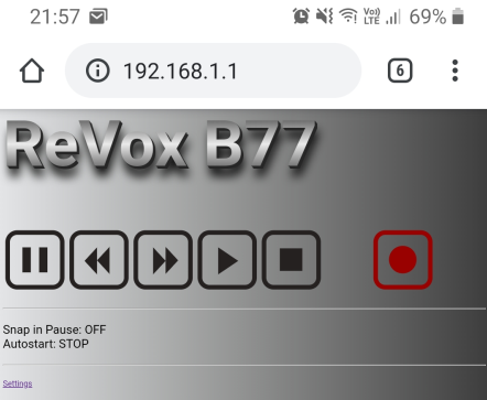 By pressing the Fast Forward >> buttons you can now switch between Wifi ON -> Wifi Accesspoint without password-> Wifi Accesspoint with password -> Wifi OFF. Here too, clicking sounds indicate the current mode. 1 click means WiFi is in normal mode to connecting your accesspoint, the device wants to integrate into your network. 2 clicks means the wifi module spans its own network called "ReVox-B77-LWSt" without password.3 clicks means the wifi module spans its own network called "ReVox-B77-LWSt" with a password. You can set the password in the webinterface. 4 clicks means the wifi module is switched off.