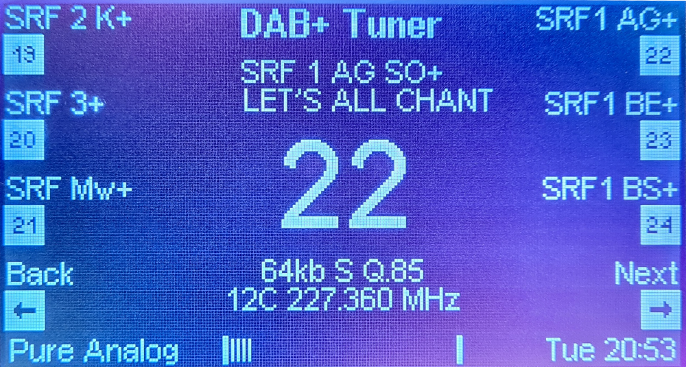(Der M51 Mk1 kann dies zwar auch, aber nur global, und nicht pro Zone). Auf diese Art können auch mehrere DAB+ Tuner vorhanden sein und in jeder Zone kann ein anderer Tuner als Haupt Tuner auf der Taste "Tuner" programmiert sein. So kann das dann zum Beispiel aussehen wenn 2 DAB+ Tuner betrieben werden: Zone 1: