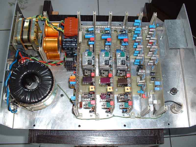 Von links nach rechts: Powersupply, Bass-Amp, Midrange-Amp, Tweeter-Amp, Filterboard,